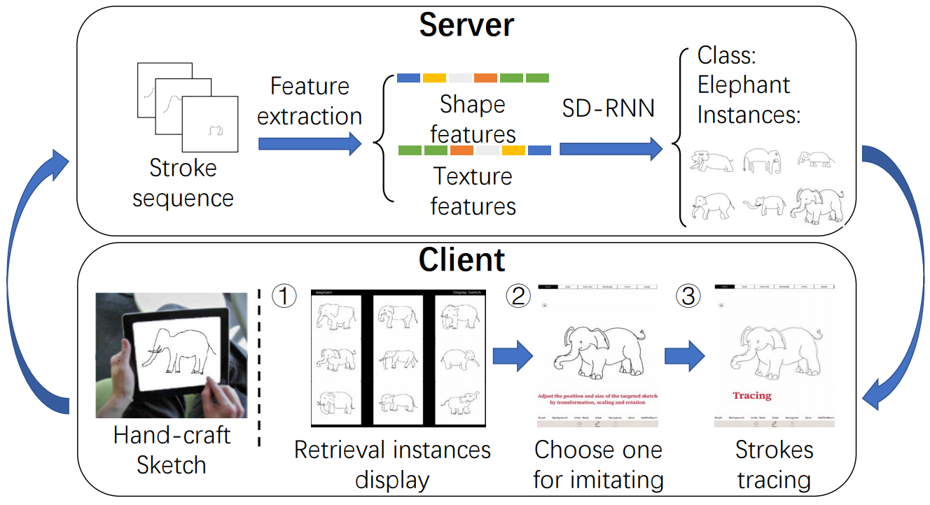 论文“Coupling deep textural and shape features for sketch retrieval”由贾棋副教授、樊鑫教授、已毕业研究生于美玉(现在滴滴出行工作)、在读博士刘宇擎、已毕业本科生王鼎荣(即将在罗彻斯特理工大学硕博连读)和美国天普大学Latecki教授合作完成。手绘草图具有高度的抽象性,近年来国内外学者针对手绘草图的识别设计了各种深度学习模型,但识别率一直在80%左右,仍然面临着巨大的挑战。不同于传统的深度学习方法对草图纹理特征的描述,立足于团队在形状分析方面的研究积累,探讨了草图特有的形状属性,提出了一个结合形状和纹理特征的时序双通道学习策略,并设计了一个两阶段递归神经网络来平衡这两种类型的特征。本文还考虑了草图的笔画顺序,以减少输入特性在类内的变化。在TU Berlin基准集上进行的大量实验表明,本文方法首次实现了90%以上的识别率,分别比人类和最先进的算法高出19个百分点和7.5个百分点。值得一提的是本文方法可以更有效地区分纹理相似但形状不同的草图。本文基于所提出方法,开发了一个在线素描检索和模仿绘画应用程序,用以辅助儿童或成人绘画,将于近期在AppStore上架相关应用。