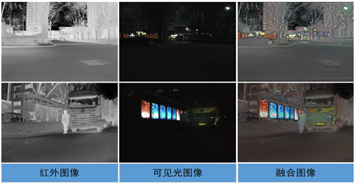 可见光成像具有丰富的对比度、颜色、形状信息,可以准确、迅速地获得双目图像之间的匹配信息,进而获取场景深度信息。但可见光波段成像也存在缺陷,如在强光、雾雨、雪天或夜晚,成像质量大大下降,影响匹配的精度。利用可见光波段双目相机与红外波段双目相机构成多波段立体视觉系统,红外成像不受雾雨雪、光照影响的优势可弥补可见光波段成像的不足,从而获取更完整、精确的融合信息。所生成的融合图像在视频监控,目标跟踪等方向都有重要的应用。下图是真实场景中实验图: