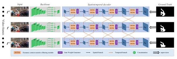 论文“Dynamic Context-Sensitive Filtering Network for Video Salient Object Detection”由研究生刘杰,19级本科生王逸飞,张淼副教授等合作完成。该工作旨在解决视频显著性目标检测(VSOD)中应对动态变化场景的不足,提出了一个动态上下文相关滤波模块(DCFM)。该模块通过估计位置相关权重,可在多个尺度生成包含丰富上下文信息的动态卷积核来提高模型对动态视频场景的适应性。其次,考虑到视频场景中时空特征间的紧密依赖特性,提出了一种双向动态特征融合策略,将Encoder-Decoder结构中的解码过程划分为多个阶段,在每一阶段均设置了一个动态融合模块,自适应的融合时空双向特征,使该模型在高挑战性场景下依然保持稳定的性能。大量的实验表明,该工作提出的DCFNet在多个公开数据集上表现出了最优性能,尤其在复杂动态的视频场景具有良好的适应性。此外,DCFM模块展现了在RGB显著性检测模型中的可扩展性,提升了其性能表现。