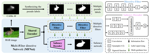 论文“MFNet: Multi-filter Directive Network for Weakly SupervisedSalient Object Detection”由研究生王健,张淼副教授等合作完成。该工作聚焦于如何有效的利用多路伪标签中的互补信息,提出了一个针对弱监督显著性目标检测的多信息整合方法。首先,该方法构建了一种基于多路指导滤波器的整合框架(MFNet),整合多路伪标签中互补的显著性信息,有效避免了单一伪标签对预测结果产生的负面影响。具体来讲,该模型中设计了一种可有效提取伪标签中准确显著性信息的指导滤波器(DF)。采用多路指导滤波器的结构整合和细化提取的显著性信息,通过设计的多路指导损失函数传递给最终的显著性检测网络。该工作提出的方法在多个公开数据集上均达到了目前最优的性能。此外,该框架框架具有较好的可扩展性,可灵活地应用到现有的弱监督SOD方法中,提高其约20%性能(MAE指标)。