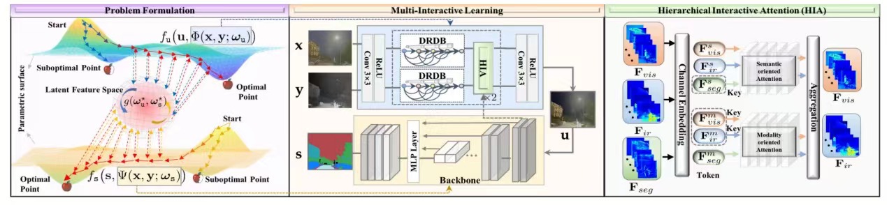 现有的融合模型只关注于单一视觉任务,没有针对下游语义感知设计,图像融合与后续感知任务难以统筹兼顾,该团队创新性地提出了语义引导的多交互特征学习架构,利用后续感知与融合任务的相关性提升两者的性能。该架构采用级联结构,包含一个融合子网络与分割子网络,通过精心设计的分层交互注意力模块实现任务之间语义信息的精细映射,从而使模态/语义特征能够充分融合。此外,论文中引入了任务动态权重因子来自动调整每个任务间相应权重,从而平衡交互特征对应关系,避免了超参数繁琐调整。多个数据集上的大量实验表明,提出方法可以生成视觉友好的融合图像,并在语义分割任务中性能指标(mIoU)比现有方法高出7.66%。该相关工作已开源至:https://github.com/JinyuanLiu-CV/SegMiF。