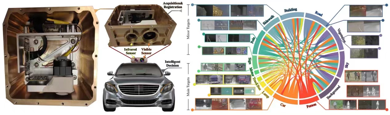 研究团队构还建了一个智能多波段双目成像系统,收集用于融合和分割任务,具有15个注释像素级类别的多模态语义分割数据集。该数据集标注率高达98.16%,包含在不同光照条件下的各种真实驾驶场景,还包括带有雨、雾、强光等特殊情况的挑战场景。所提出的数据集克服了领域现存数据类别较少、注释稀疏和场景单调的问题,用以促进实际的自动驾驶和语义理解任务的发展。