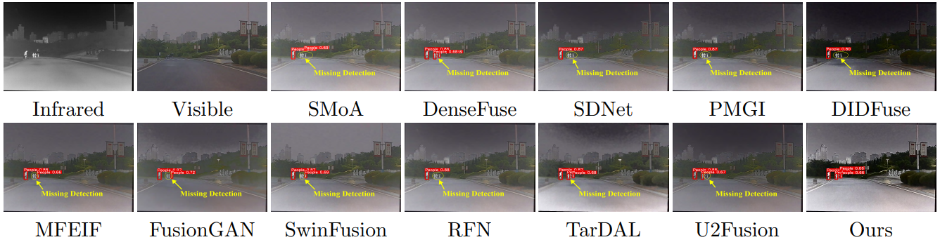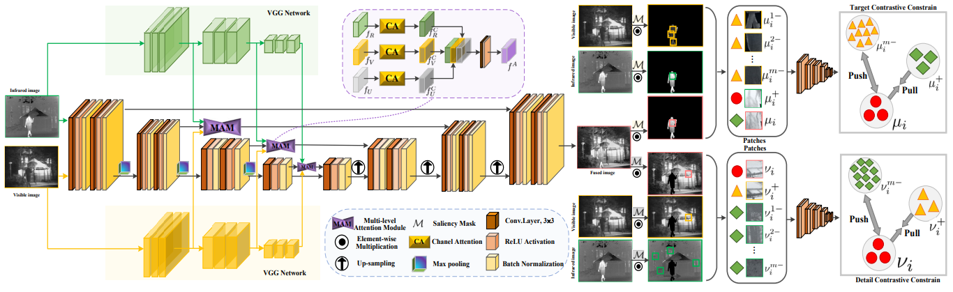 多模态图像融合通过综合不同传感器获取的互补信息,来获取显著提升信息量和质量的融合图像,对于增强视觉和改善图像语义分析应用具有重要意义。团队发现现有的深度学习多模态图像融合算法主要通过构造各种损失函数来保存互补特征,但通常忽视了不同传感模态间的内在联系,造成融合结果中存在冗余或无效信息。为了解决这一难题,该论文创新性地提出一种耦合对比约束来优化损失函数,使融合图像的前景目标/背景细节与相应的红外/可见光源图像在特征表示空间中紧密联系的同时远离另一模态的特征,有效避免了融合过程中的失真现象。此外,论文引入了一个多级注意模块,用于学习丰富的层次特征表示,并在融合过程中全面地传递语义信息特征,成功地在多个图像融合任务以及后续的语义感知任务中实现了促进作用。相关成果已开源至https://github.com/runjia0124/CoCoNet.