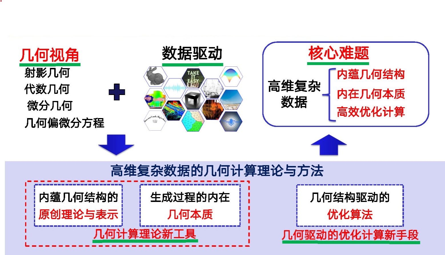 此次获奖的成果“高维复杂数据的几何计算理论与方法”聚焦于高维复杂数据处理这一前沿领域。如何有效表示、挖掘内嵌于高维数据的低维本质结构、并实现高效计算,是信息科学领域的核心难题。项目团队从几何视角出发,发现并证明了经典代数几何中全新射影不变量—特征数,突破了传统不变量无法描述高维数据的瓶颈,相关成果作为继经典的霍夫算法后唯一的椭圆检测算法被国际权威开源视觉算法库OpenCV收录。提出基于几何变分法的最优传输映射算法,揭示生成模型的内在本质规律,解决多模态高维数据生成学习的分布间转换难题。同时,提出几何驱动的高效优化算法,实现低秩矩阵计算复杂度从经典算法 O(n^6)降为理论最低O(n)的突破。