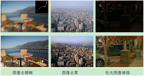 该论文是该团队长期关注深度学习可解释性工作的又一标志性成果,主要作者包括刘日升副教授、程世超(博士)、马龙(硕士)、樊鑫教授和罗钟铉教授。论文针对深度模型虽然在许多应用领域都取得了巨大成功,但其可解释性和理论分析仍然缺失的问题,提出了一种全新的可展开非凸优化,将深度模型通过误差校正机制引入到优化迭代过程中。全文从算法模型、收敛分析和实际应用三方面完善的介绍了该深度可展开模型的严谨性和有效性。其中收敛性分析通过刻画目标函数的下降解释了深度网络可以通过数据驱动学习到一个好的梯度方向,以帮助算法快速收敛。如图所示,该工作提出的框架可以有效的应用在图像去模糊、去雾等各种视觉问题中并取得最先进的效果。该工作得到审稿人的一致好评,只经过一轮修改即被录用。
