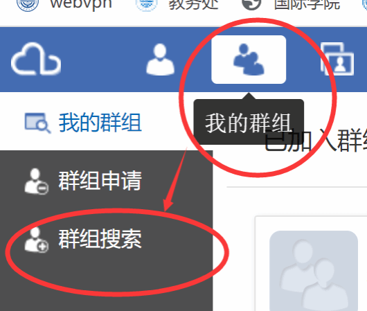 (2) 依次点击左上方“我的群组”-“群组搜索”图标,在右上方搜索框内输入“软国毕业设计管理”即可查询、申请加入;