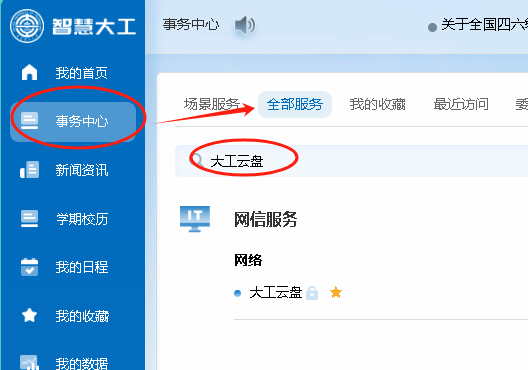 (1) 进入校园门户,在“事务中心”-“全部服务”中搜索“大工云盘”,点击进入;