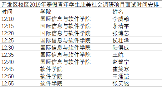 经过前期学生自主报名,开发区校区共收到10名学生的报名申请,现开展2019年寒假青年学生赴美社会调研项目的面试,。为保证不遗漏面试信息,还要请大家通知报名参加“2019年寒假青年学生赴美社会调研项目”的同学,于10月19日(周五)中午12点10分到教学区A109参加面试,届时将由软件学院与国际信息与软件学院学生工作办公室、中国对外友好合作服务中心联合开展面试工作,面试形式为个人面试,每人面试时间5分钟。同时,同学们对于此项目存在的疑问也可进行现场提问,工作人员将给与解答,具体时间安排详见下表。