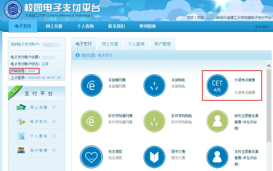 在电子支付页面选择“外语考试缴费”,根据提示填写相关信息,包括电子支付密码、预留信息等完成缴费。缴费成功后会弹出提示对话框,在“个人查询”栏目中可查询缴费记录,有缴费记录表示报名缴费成功。