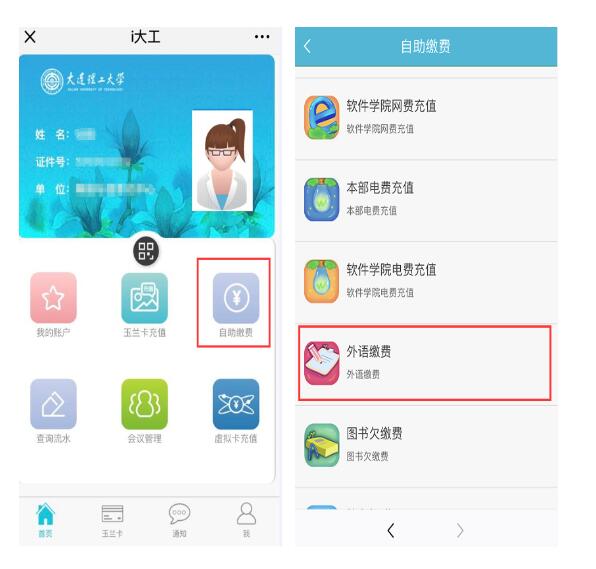 进入“i大工”,在玉兰卡首页,选择“自助缴费”栏目中的“外语缴费”,根据提示填写相关信息,包括玉兰卡密码等完成缴费。缴费成功后会弹出提示对话框,在“玉兰卡”的“流水查询”栏目中可查询缴费记录,有缴费记录表示报名缴费成功。