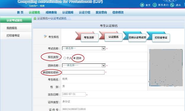 (2)报名(请注意:在”个人注册报名“中报名)。如下图所示,进入“认证报名”——》“认证考试报名”,在报名类型一项选择“团体”,并选择相应的团体名称(学校名称),将参团密码填写在“参团报名密码”一项中即可享受团体报名资格。(参见下图)大连理工大学的参团密码为:jp919sk42oau,此密码只供我校报名参加CSP认证的同学使用。
