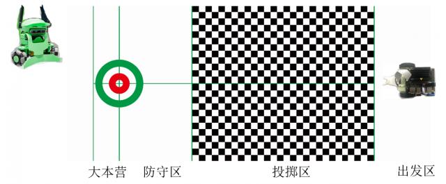机器人桌上冰壶人工智能挑战赛参照桌上冰壶球比赛规则,实行小组赛与决赛。场地如图所示,尺寸长140cm、宽60cm,由PVC薄膜打印指定图案。比赛用球为底部钢制滚珠桌上冰壶球(桔蓝两色),重量30g,直径3cm,高2cm。每支参赛队只能使用一台机器人,机器人框架指定使用NVIDIA Jetbot,指定搭载Jetson Nano开发板,可以根据实际需要进行相应的改装。