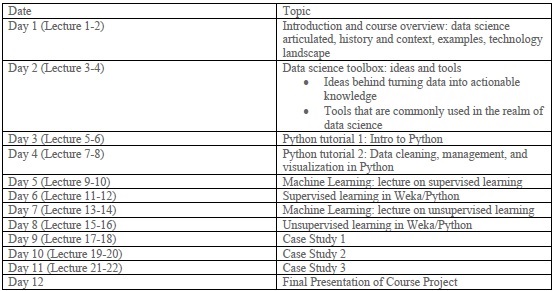 在教学助理(即具有计算机科学或生物医学信息背景的研究生)的帮助下,帮助学生获得数据科学实践经验。下表1显示暂定的时间表和相关的课程题目。