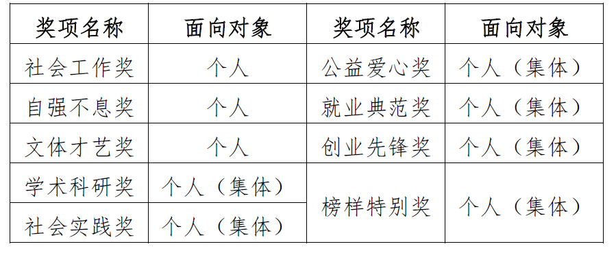 评选活动将评选九个方面的学生先进个人(集体)及入围奖 若干,并实行弹性奖项制,各奖项数量约为2-5个,本着优中选优、宁缺毋滥的原则,开展相关评选工作,奖项最终获奖 名额将由评选工作委员会根据评选工作实际确定。具体如下: