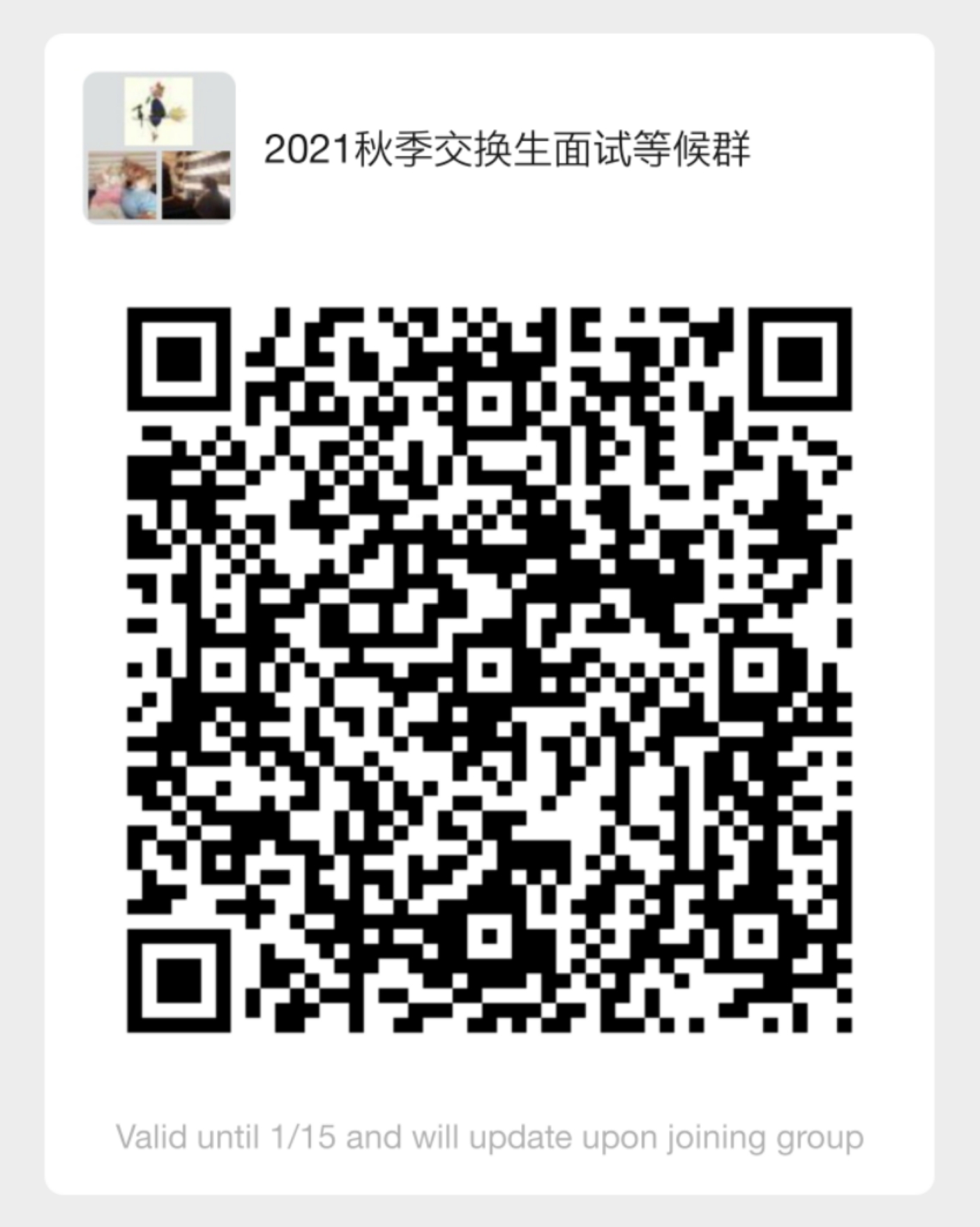 经院系初审、国际处复审报名材料,现通知以下38名同学参加2021年1月14日(周四)的校内评审。为稳步推进疫情防控工作并确保相关业务及时、有序处置,本次交换生面试均采用线上视频面试形式,请各位同学扫描下方二维码入群,入群后请以“地区-申请学校-姓名”(例如:日本-东京大学-张三)备注名称,该群作为面试等候群,请注意群内通知,听从工作人员统一安排。