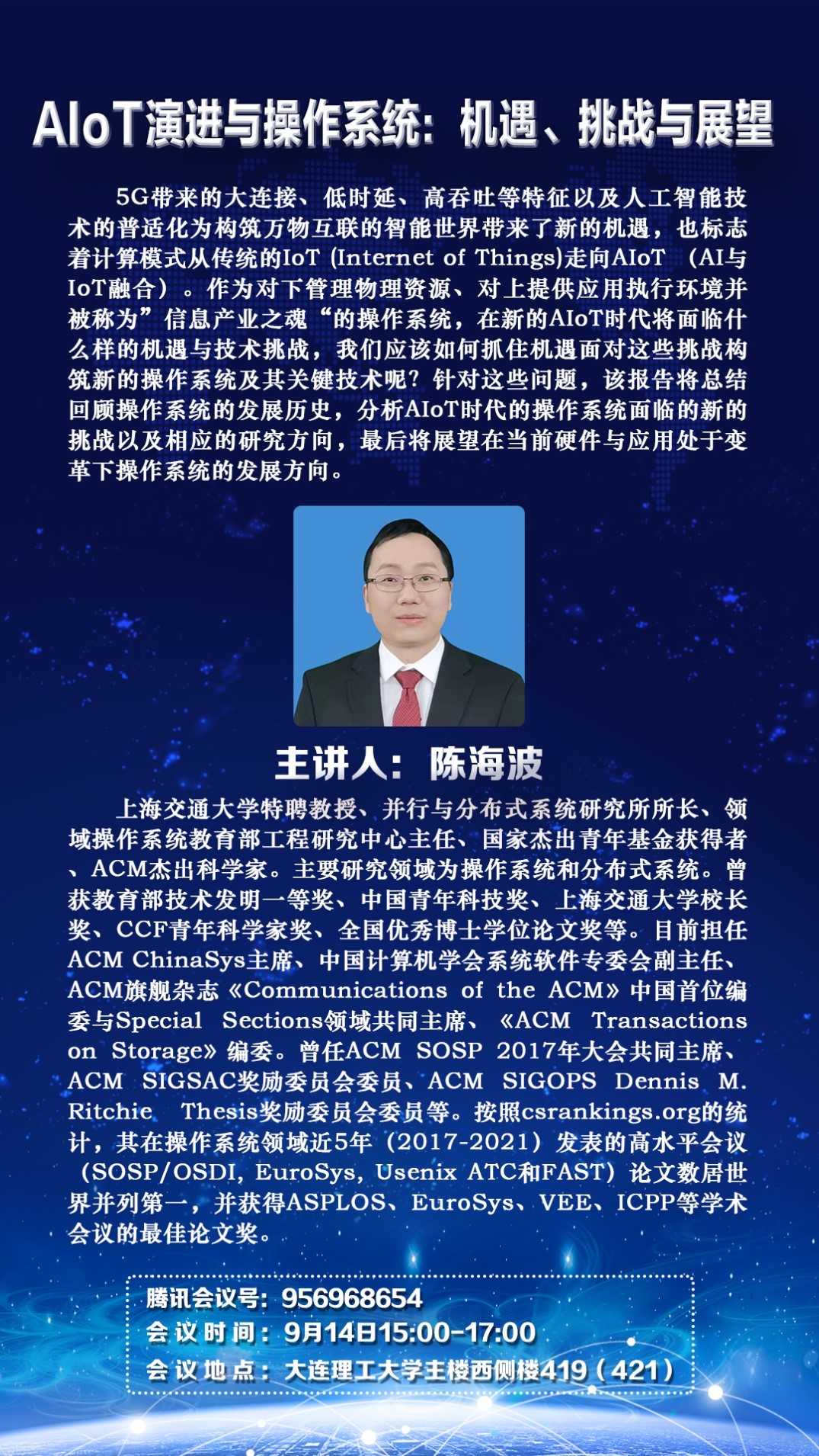陈海波,上海交通大学特聘教授、并行与分布式系统研究所所长、领域操作系统教育部工程研究中心主任、国家杰出青年基金获得者、ACM杰出科学家。主要研究领域为操作系统和分布式系统。曾获教育部技术发明一等奖、中国青年科技奖、上海交通大学校长奖、CCF青年科学家奖、全国优秀博士学位论文奖等。目前担任ACM ChinaSys主席、中国计算机学会系统软件专委会副主任、ACM旗舰杂志《Communications of the ACM》中国首位编委与Special Sections领域共同主席、《ACM Transactions on Storage》编委。曾任ACM SOSP 2017年大会共同主席、ACM SIGSAC奖励委员会委员、ACM SIGOPS Dennis M. Ritchie Thesis奖励委员会委员等。按照csrankings.org的统计,其在操作系统领域近5年(2017-2021)发表的高水平会议(SOSP/OSDI, EuroSys, Usenix ATC和FAST)论文数居世界并列第一,并获得ASPLOS、EuroSys、VEE、ICPP等学术会议的最佳论文奖。