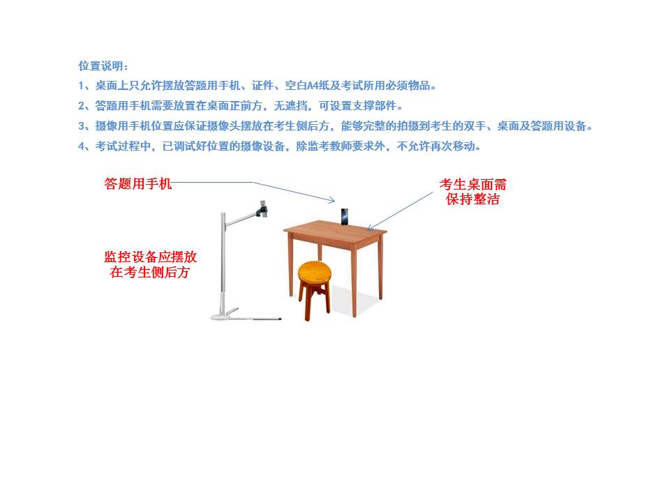 3、环境准备:考试用的房间(或区域),考试期间不得有其他人员进出或在场(隔离学生视条件确定)。提前准备好设备摆放位置,要求如图所示,监控区域应保证能覆盖学生本人、考试环境和答题设备屏幕,桌面上只能保留证件(身份证、玉兰卡或学生证)及考试必须物品。若出现与考试无关物品且不按要求整理的,按违纪处理。保障稳定、通畅的网络环境。图例仅供参考。