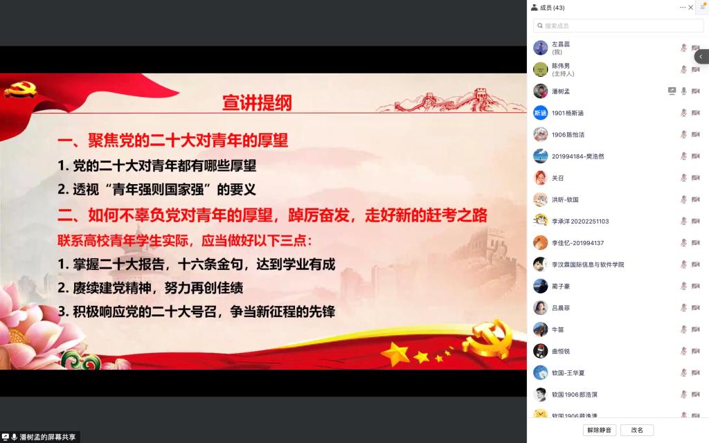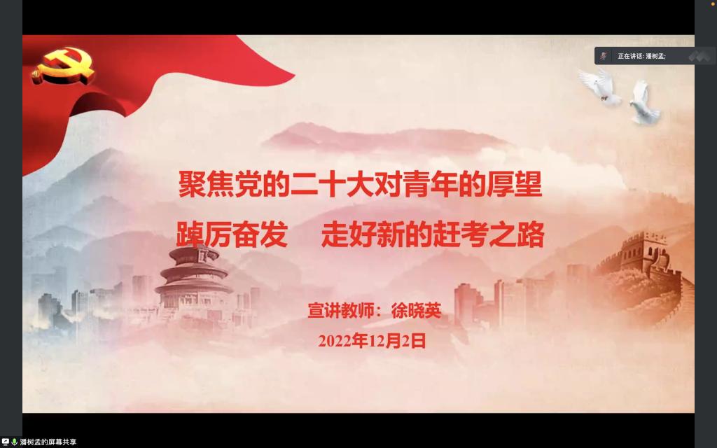 徐晓英副研究员以《聚焦党的二十大对青年的厚望,踔厉奋发走好新的赶考之路》为题,聚焦党的二十大对青年的厚望,解析“青年强则国家强”的要义,寄语学生不辜负党对青年的厚望,踔厉奋发走好新的赶考之路,鼓励同学们掌握二十大报告十六条金句,赓续建党精神,积极响应党的二十大号召,争当新征程的先锋。