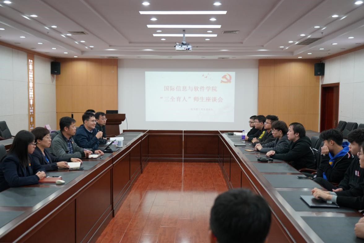 11月12日,国际信息与软件学院机关教工党支部在信息楼302会议室组织“三全育人”师生座谈会,听取学生代表在学习、生活各方面的意见与诉求。院长樊鑫、副书记兼副院长辛永亮、机关教工党支部全体党员、各年级19位学生代表参会。