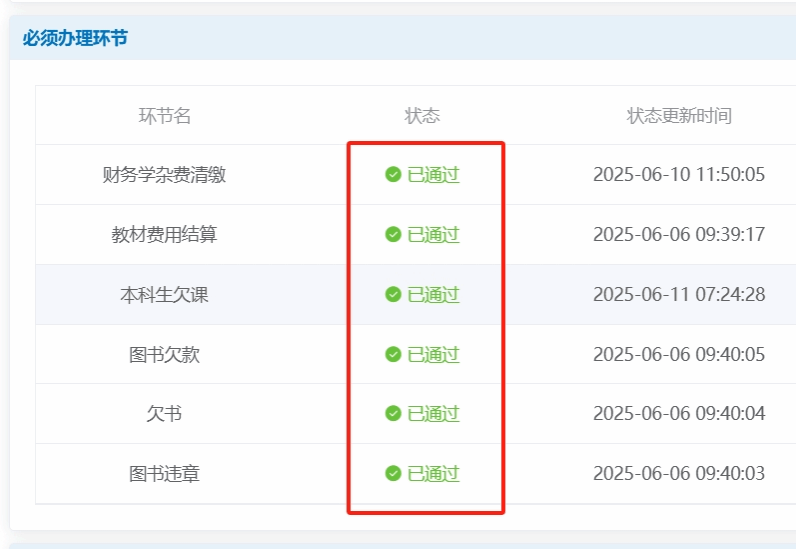 毕业生领取证书之前必须在离校报退系统(http://lx.dlut.edu.cn)中完成报退手续,所有“必须办理环节”均为“通过”状态(如下图所示),才能领取证书。