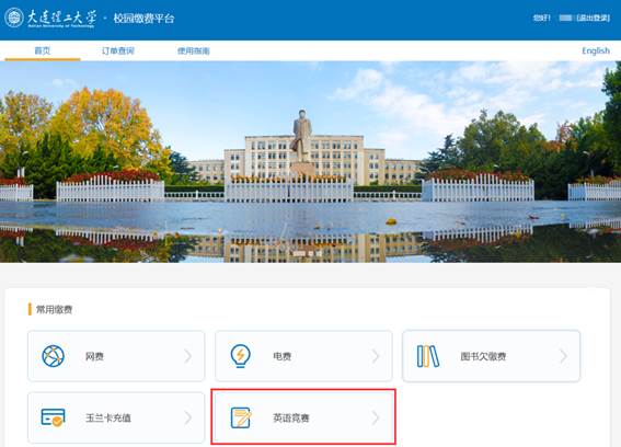 进入“i大工”首页,选择“校园缴费平台”服务,选择“英语竞赛”,根据提示填写相关信息。缴费成功后会弹出提示对话框,在“订单”栏目中可查询缴费记录,有缴费记录表示报名缴费成功。