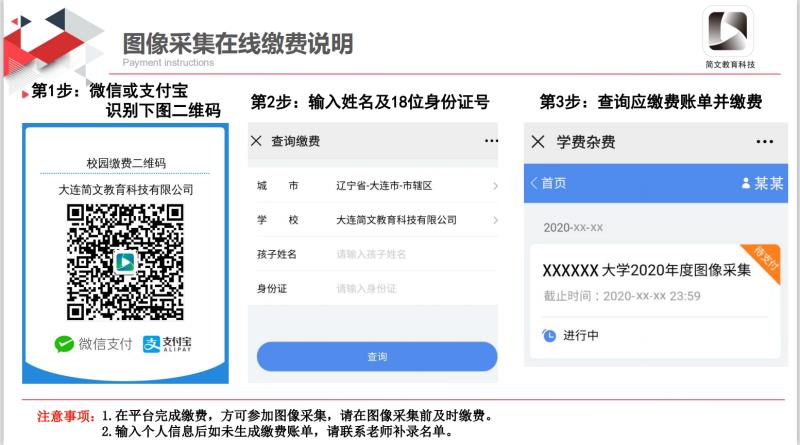 2.缴费标准:图像信息集中采集收费标准每人17元,直接交给大连简文教育科技有限公司。