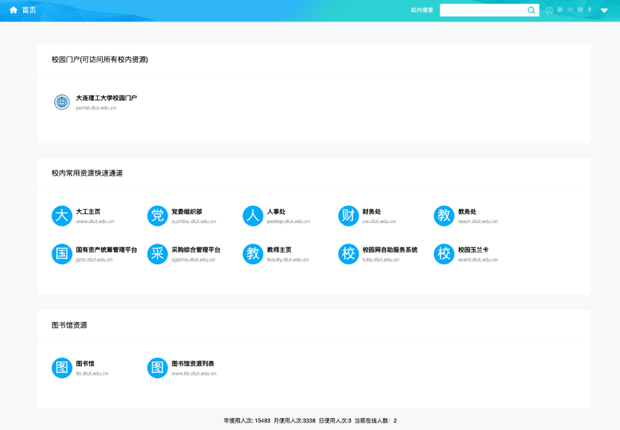 点击校内门户,可直接进入校园门户,可在校园门户中继续点击相应的业务系统或校内资源进行访问。校内常用资源快速通道,已列出师生常用的业务系统,可点击对应的资源图标,快速访问该资源。图书馆资源,可直接访问图书馆主页,或点击进入图书馆资源列表。在图书馆资源列表中,继续点击需访问的资源,可下载文献或资料。