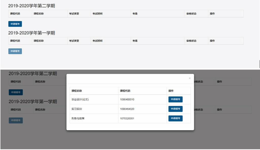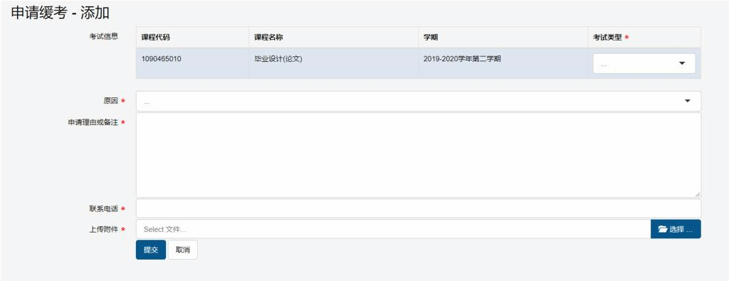 1、 点击操作下的“申请缓考”按钮,填写申请表单。