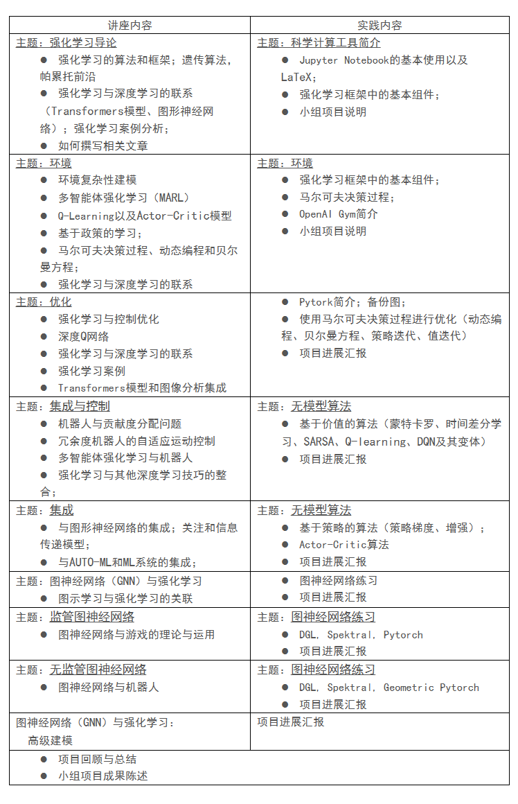 6.课程内容:课程将探讨深度强化学习的最新潜力,侧重于强化学习和深度学习的基础知识(包括卷积神经网络、图形神经网络、生成神经网络和Transformer模型),并将分享机器人和游戏中的实例,从而加强学生对深度学习核心理念的了解,提升相关的研究技能与实用技巧。