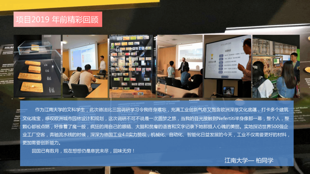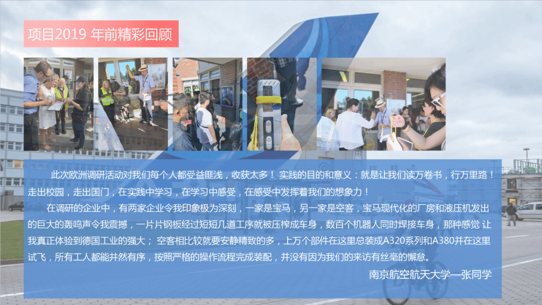 慕尼黑工业大学中国学生学者联合会、德意志联邦银行、梅赛德斯奔驰汽车有限公司-工厂/奥迪全球智能化工厂、空客汉堡航空技术有限公司、拜耳集团、大众iD新能源透明工厂、BÖHLER公司