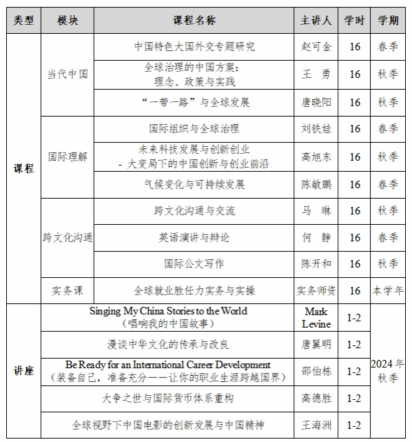 “课程”由“当代中国”“国际理解”“跨文化沟通”三个模块构成,包含9门核心课程(课程代码GCC-101至GCC-303)、1门实务课程(课程代码GCC-401)及9场系列讲座,共计约178学时。学生可根据自身情况灵活选择;“实践”包含国内外调研考察、深度参访、研修研学、实习实训等9项以上的系列活动。