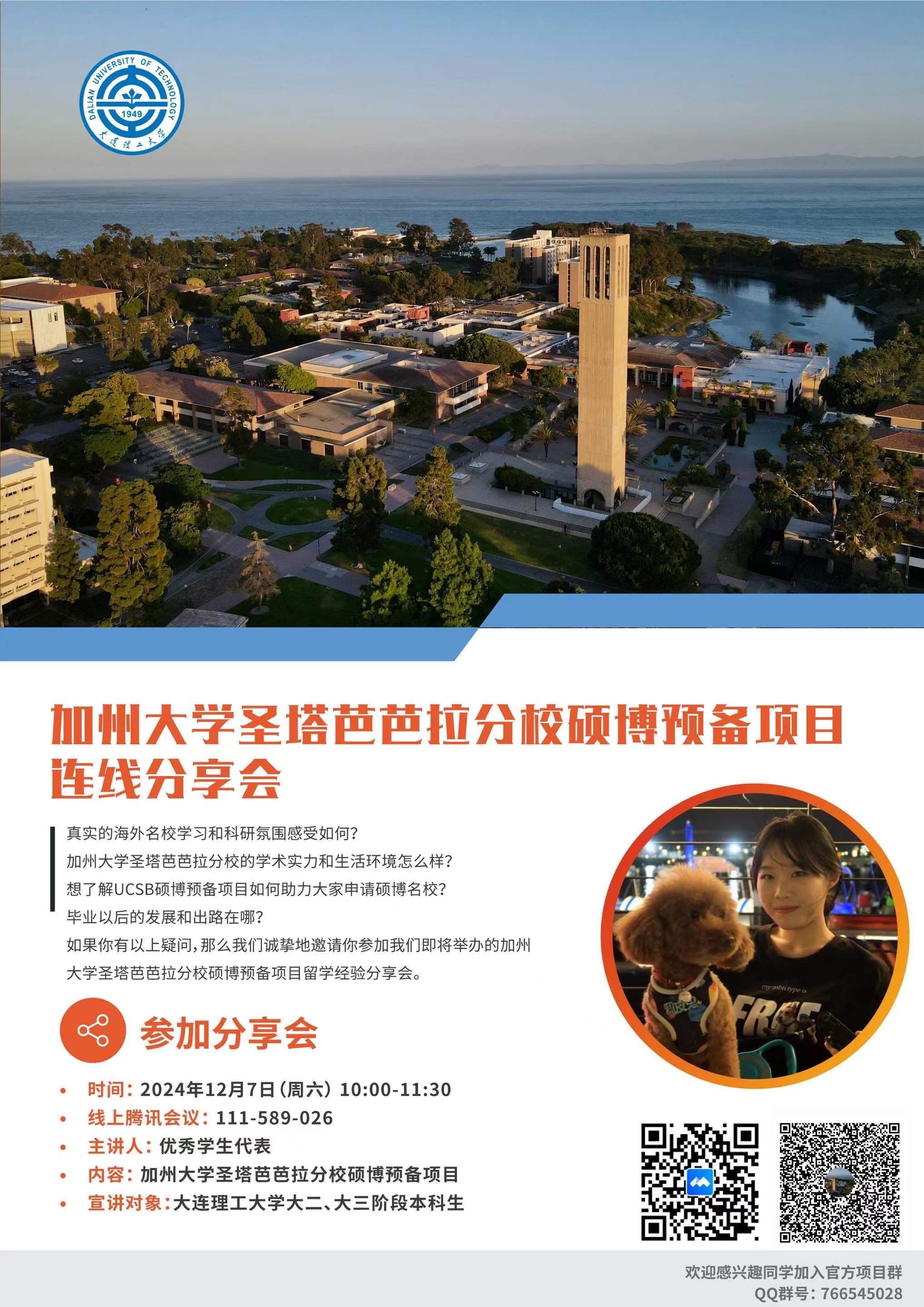 加州大学圣塔芭芭拉分校GAPP硕博预备项目现面向我校大二、大三年级学生进行连线分享会。
