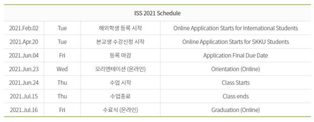 成均馆大学(Sungkyunkwan University),自1398年成立, 2020年QS世界大学排名中位于第88名,亚洲第10名。韩国成均馆大学2021年线上国际夏令营(简称ISS)为学分制暑假短期自费项目,该项目将推出不同学科领域的70余项课程,由来自成均馆大学的40余名知名教授进行线上授课。项目通过课程深化专业知识学习的同时,也旨在培养学生的全球视野与交流观点能力。