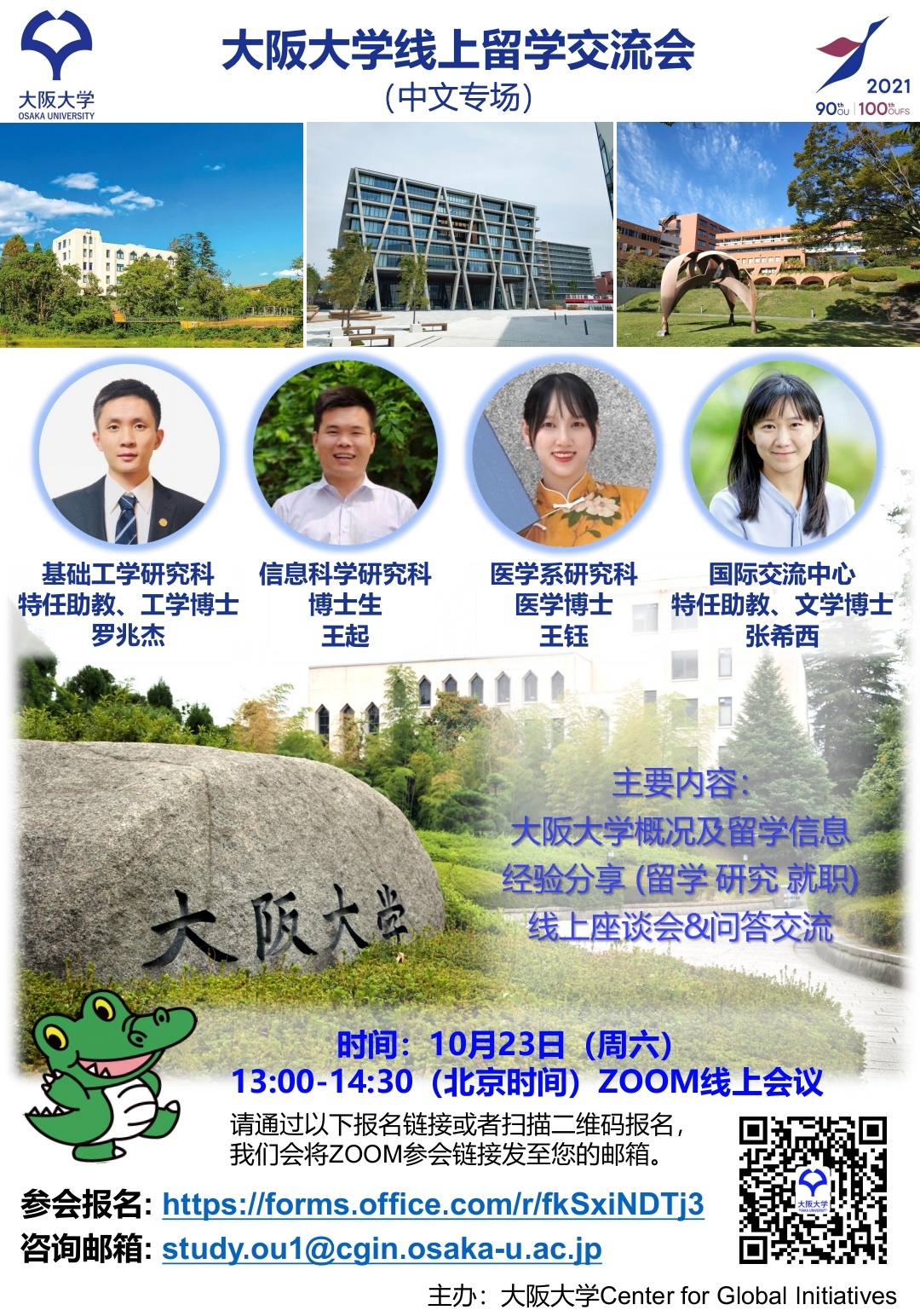 大阪大学基于双方友好合作基础,继9月线上说明会后,特别于10月23日为我校举办第二次线上信息说明会。将针对大阪大学概况及留学信息、学生合作交流项目介绍、等方面展开第一手信息介绍,更有大咖座谈跟同学们深入分享专业经验。凡是有参与大阪大学项目意愿或有兴趣赴日深造的同学,即可报名参加。