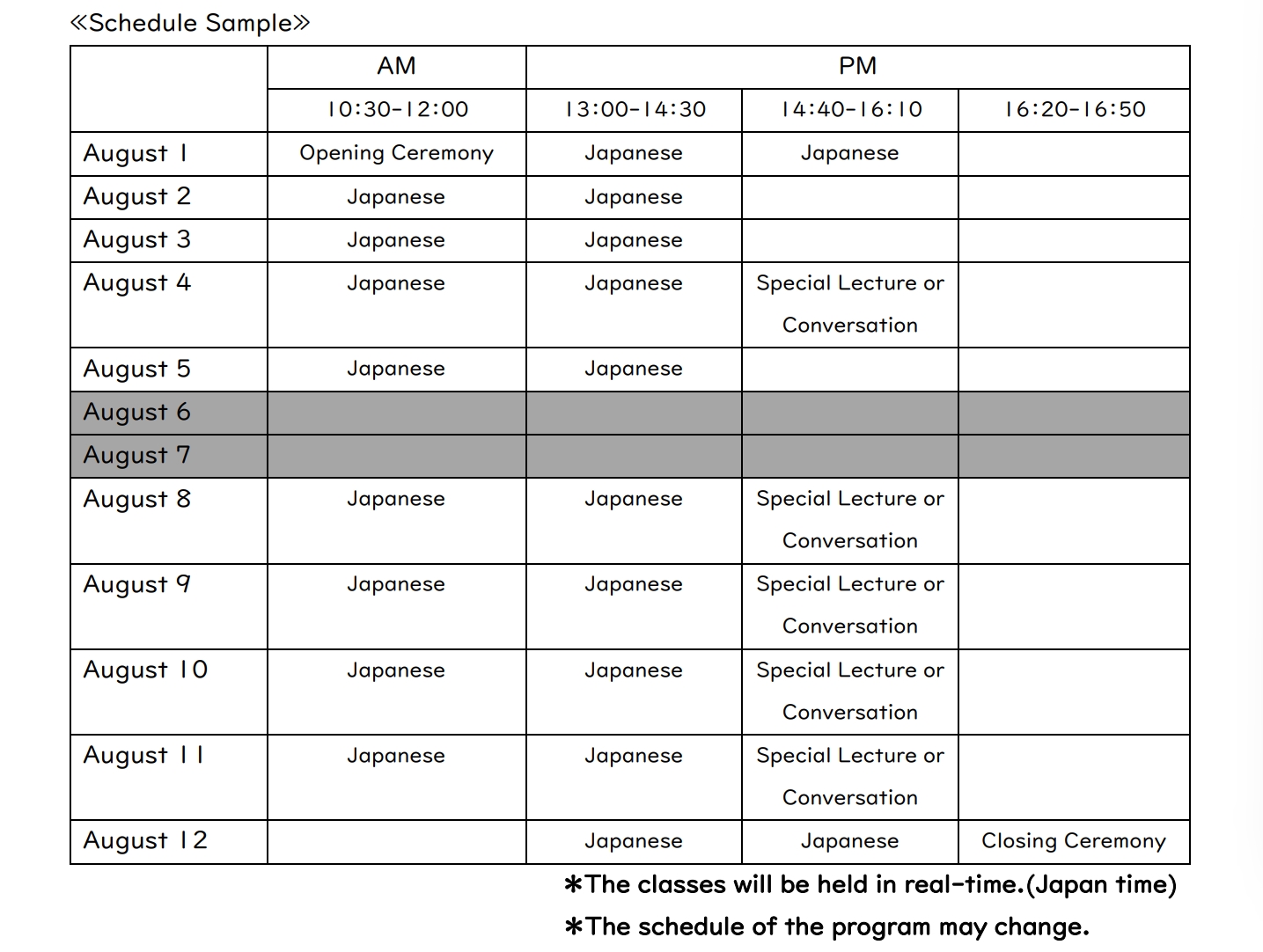 课程以《分阶段日本语》及《特别讲座/日语会话》结合的形式,按照各日语水平分别授课: