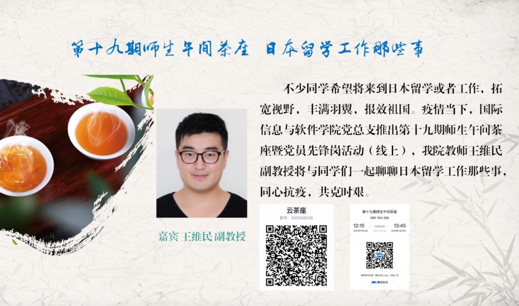 国际信息与软件学院党总总支还将在疫情期间陆续推出党史学习、中国文化、经验分享、心理调适等话题的师生午间茶座,同心抗疫,共克时艰,欢迎广大师生参加。