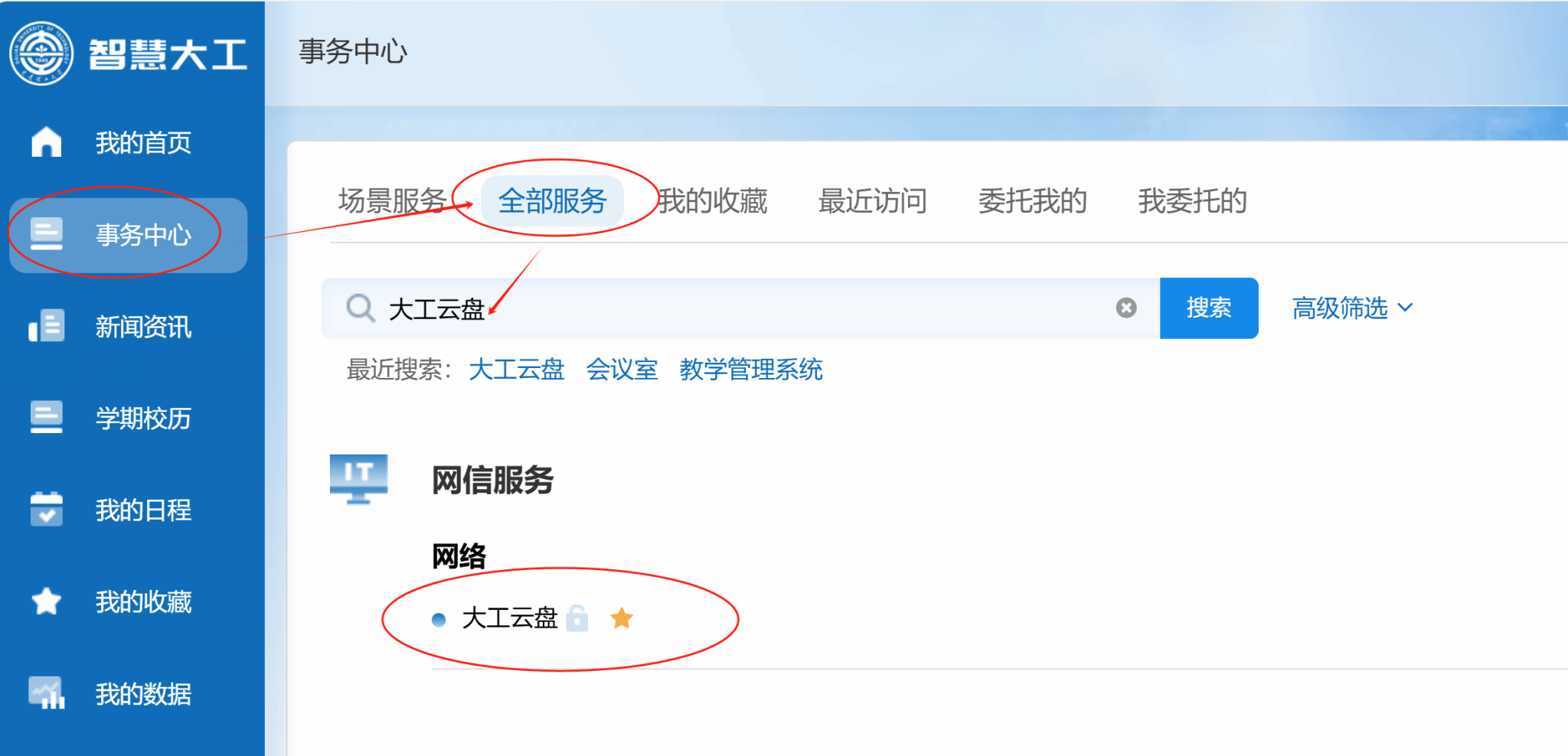 1、进入校园门户,在“事务中心”-“全部服务”中搜索“大工云盘”,点击进入;