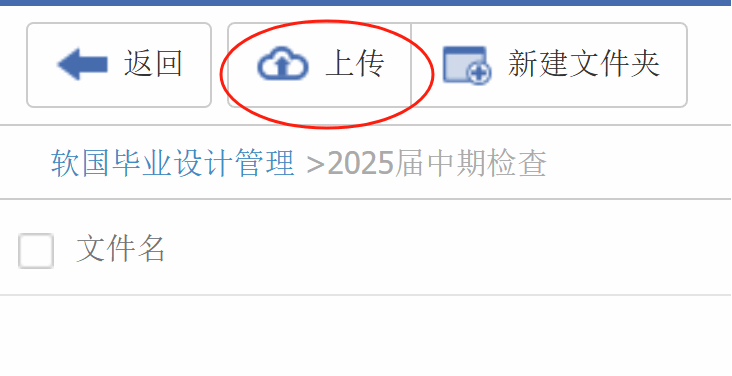 3、点击进入“2025届中期检查”文件夹,点击“上传”,即可上传自己的中期检查材料;